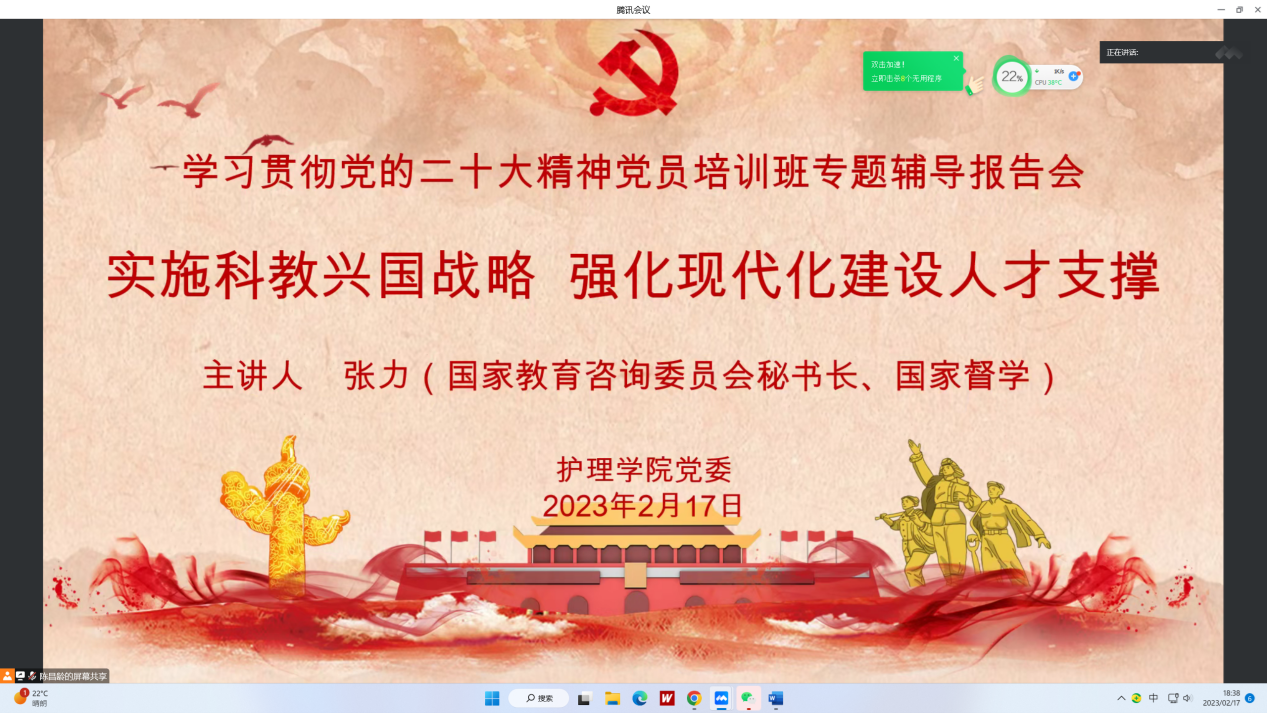根据学院党委学习贯彻党的二十大精神党员培训班方案安排,2月17日晚上7点,h漫画 党委通过腾讯会议举行学习贯彻党的二十大精神党员培训班第四次专题辅导报告会。本次专题辅导报告的主题是:实施科教兴国战略,强化现代化建设人才支撑。主讲人为:张力(国家教育咨询委员会秘书长、国家督学)。学院全体师生党员、发展对象、入党积极分子以及马克思主义学习小组成员近200人集体收看了中国干部网络学院门户网站“学习贯彻党的二十大精神网上专题班”相关辅导报告视频。专题辅导报告会由学院党委陈昌龄书记主持。